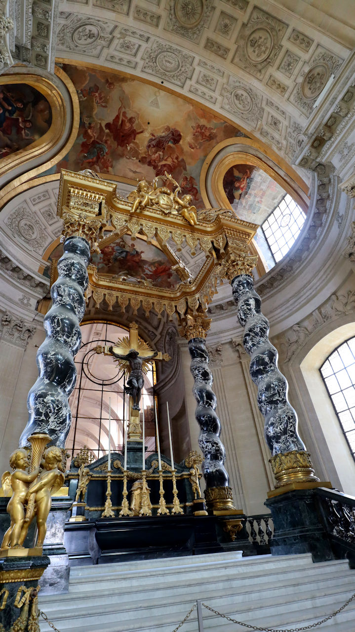 Der bekannteste Teil der Anlage ist der Invalidendom (Dôme des Invalides), der durch seine goldene Kuppel weithin sichtbar ist. Die Kirche wurde im späten 17. Jahrhundert errichtet und gehört zu den bedeutendsten Barockbauwerken Frankreichs.