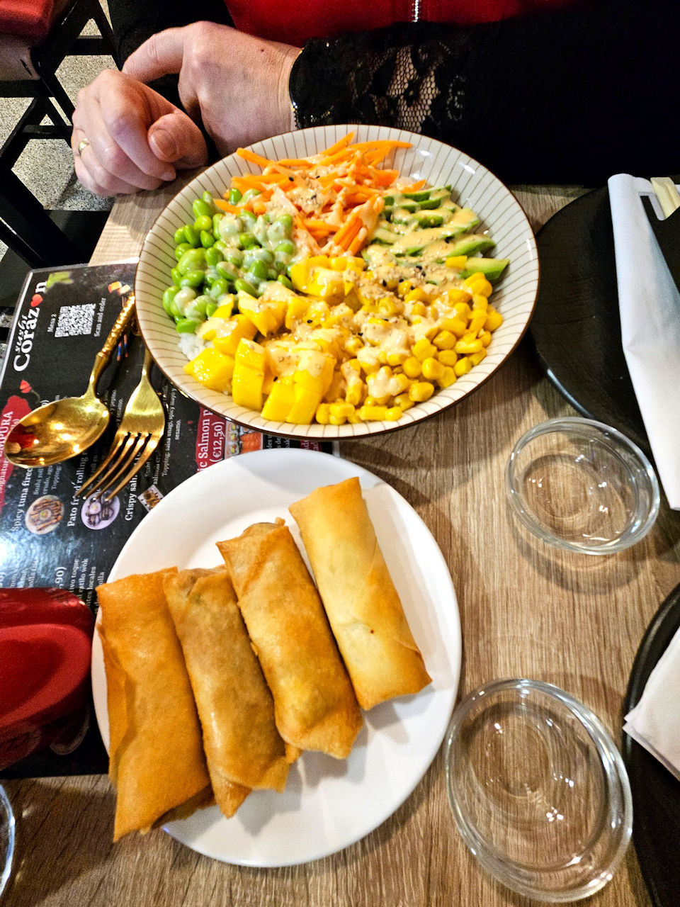 Heute stand uns der Sinn nach Asien und auf dem Weg lag das „Sushi Corazon”. Wir wurden freundlich begrüßt und zu einem Tisch gebracht. Wir bestellten Frühlingsrollen, Hähnchenspieße, eine Bowl und Chowmien. Alles hat gut geschmeckt und das Preis-Leistungs-Verhältnis passte auch. Alles hat gepasst, weshalb wir das Restaurant empfehlen können.