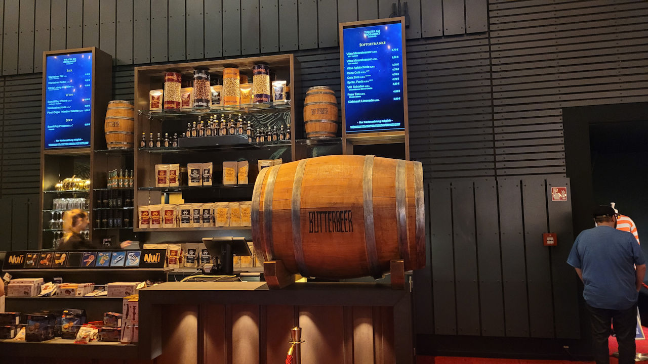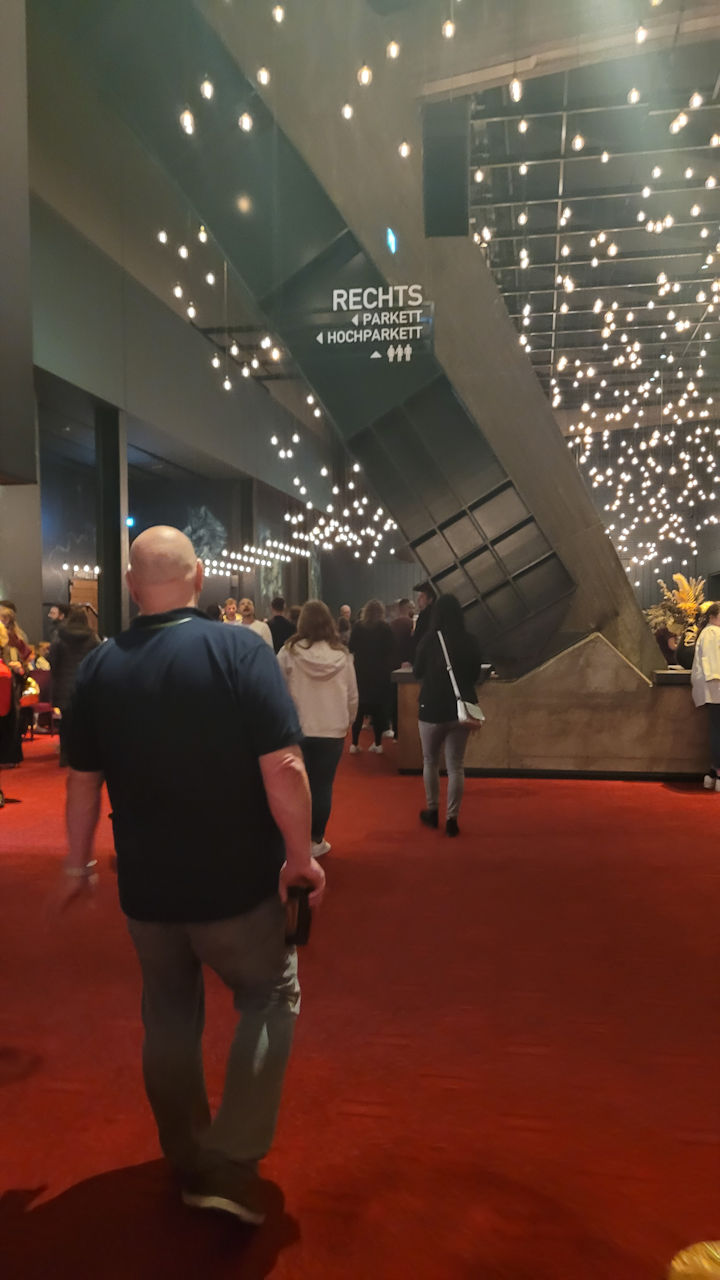 Nachdem wir das Theater erreicht hatten, ... Das übliche Prozedere begann. Ticketkontrolle, Taschen durchsuchen, Garderobe – alles war gut organisiert. Im ersten Aufenthaltsbereich konnte man auch essen und trinken. Getränke in die Vorstellung mitzunehmen ist allerdings nur mit Pfandbecher möglich. Die Bezahlung ist nur mit Karte möglich. Auch der Eingangsbereich zum Saal ist passend dekoriert. Hier kann man wieder Getränke sowie Souvenirs kaufen. Nicht billig, aber ich denke, noch ok.