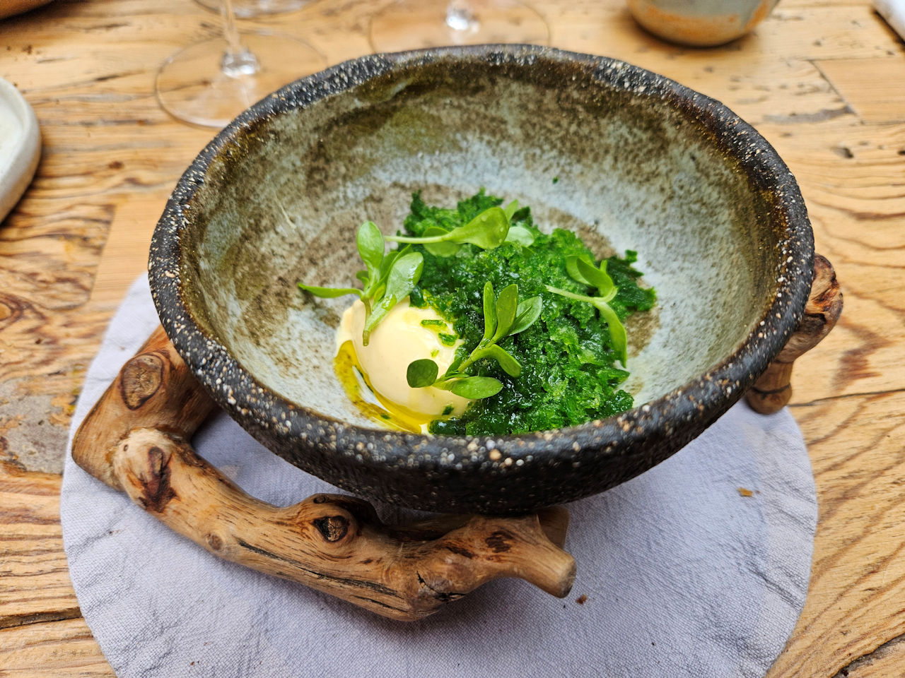 Das Restaurant arbeitet überwiegend mit festen Menüs, die sich je nach Saison verändern. Die Gerichte orientieren sich an der lokalen Landschaft und spiegeln die verfügbaren Produkte der jeweiligen Jahreszeit wider.